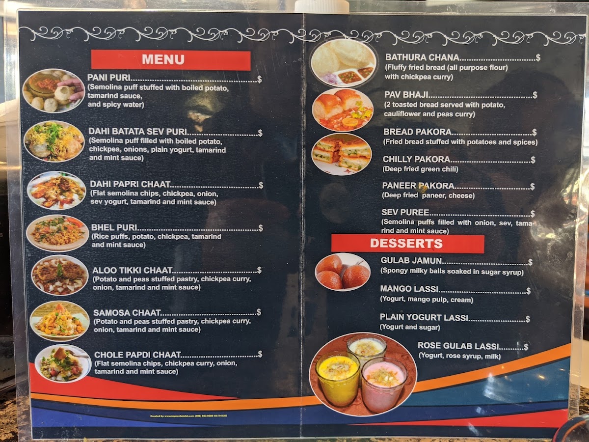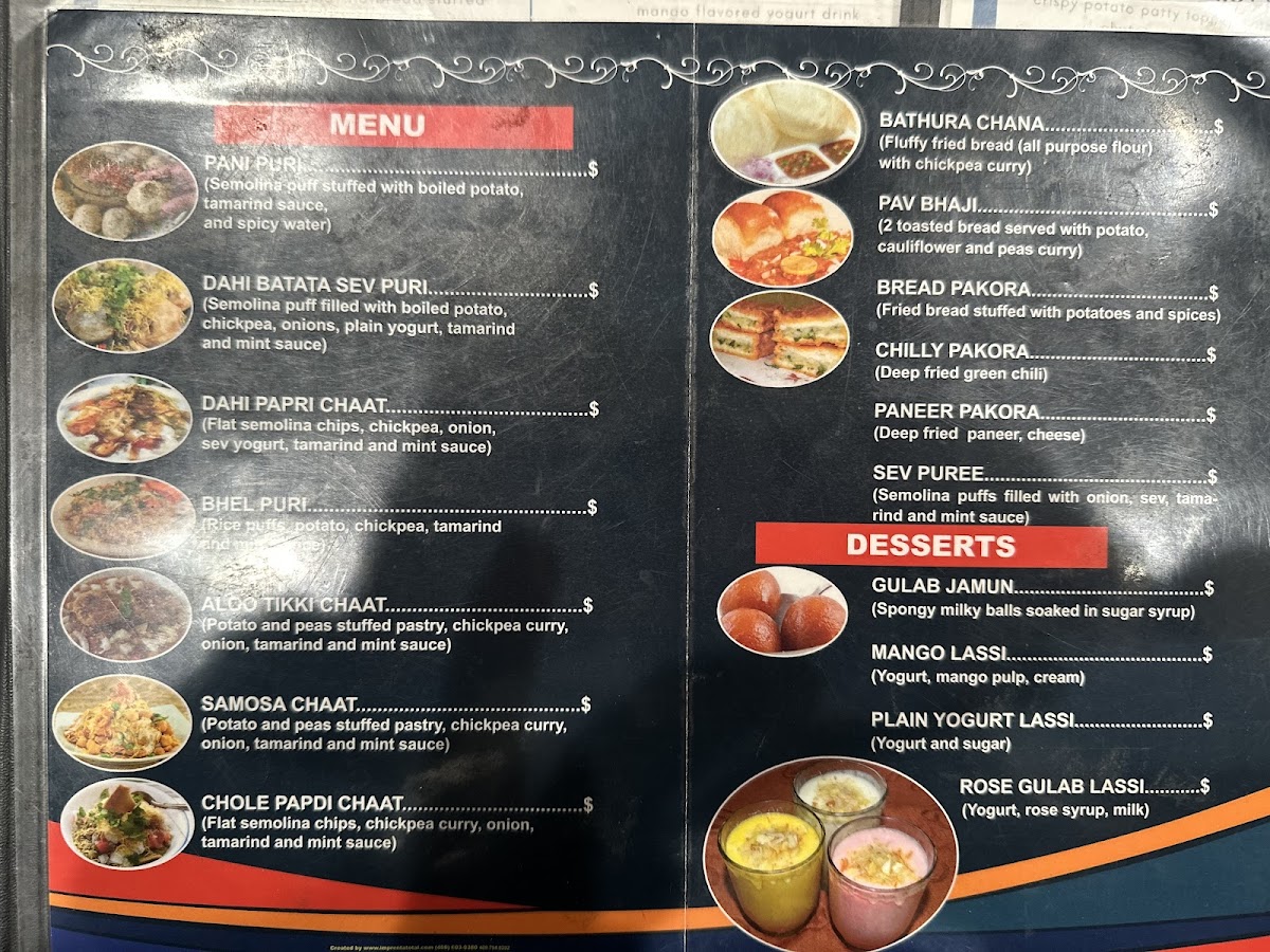 The menu showcases an impressive range of traditional Indian delicacies, with a particular focus on chaat—a popular form of street food known for its bold flavors and diverse textures. Among the highlights, the Chole Bhature stands out, featuring two generously-sized stuffed bhaturas paired with perfectly cooked garbanzo beans that burst with flavor, priced at just US$19.99. For something a bit lighter but equally tasty, don't miss the Pav Bhaji, a savory blend of spiced vegetables served with soft pavs for just US$14.99.